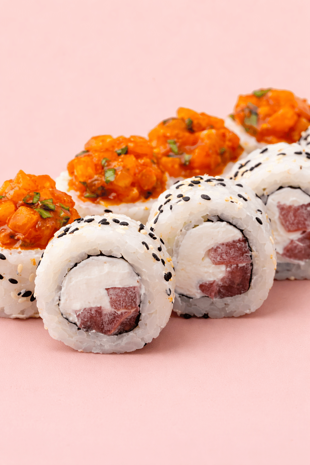 Сочный тартар из лосося с соусом Ким Чи, томатом и сливочным сыром. Подается с рисом, нори и зеленым луком 8 шт.