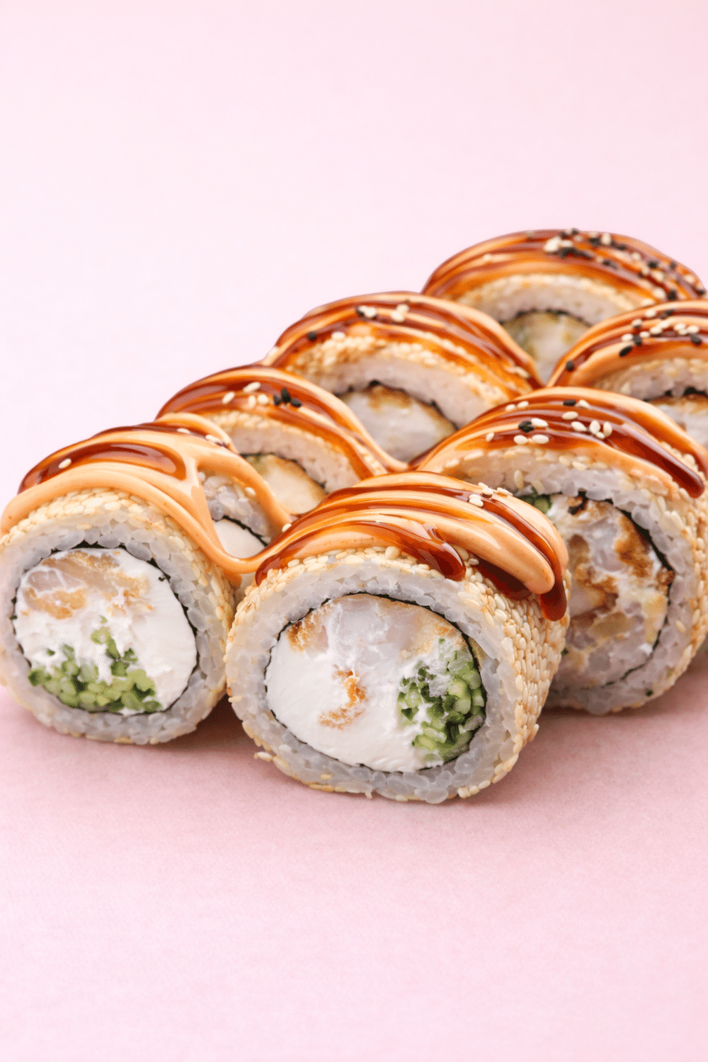 Хрустящая креветка темпура, творожный сыр и огурец под дуэтом соусов унаги и спайси. Посыпан кунжутом 8 шт.