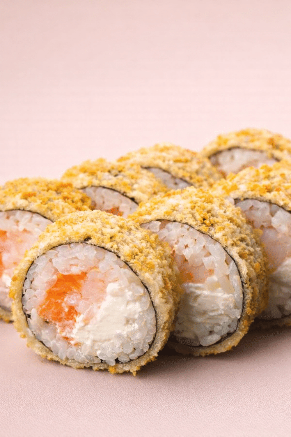 Лосось, креветка, творожный сыр, лист нори, рис, темпурный кляр, панировочные сухари и фирменный соус айоли 8 шт.