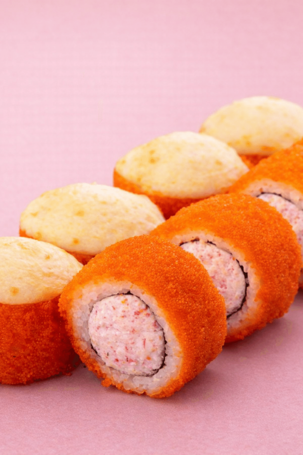 Рис, лист нори, снежный краб, икра масаго. Запеченый под сырно-чесночной шапочкой 8 шт.
