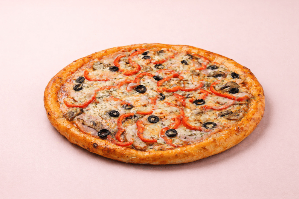Сытная пицца с ветчиной, копчёной курицей, шампиньонами и болгарским перцем. Сбалансированный вкус с лёгкой остринкой и томатной основой (735 гр.)