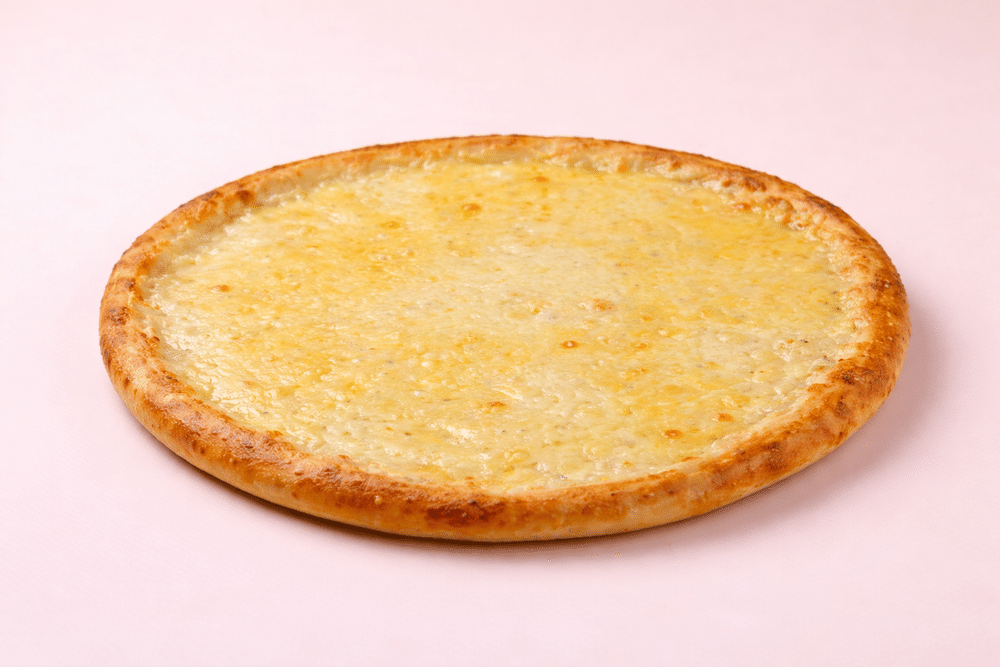 Пицца на сливочном соусе с моцареллой, чеддером и пармезаном. Насыщенный сырный вкус и тягучая текстура с выразительным сливочным послевкусием (590 гр.)