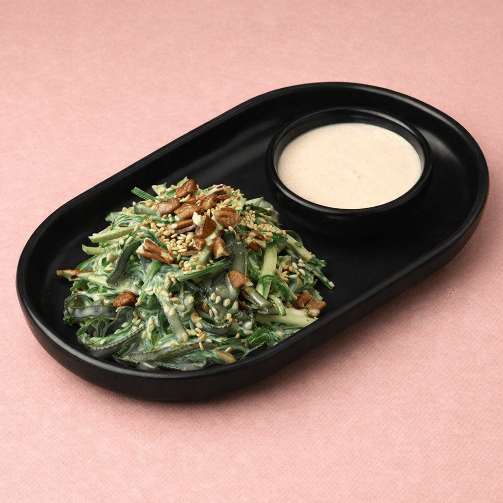 Нежный салат из морских водорослей чука с ореховым соусом, хрустящими грецкими орехами и обжаренным кунжутом. Лёгкая сладость свежего яблока добавляет свежий акцент и балансирует морской вкус