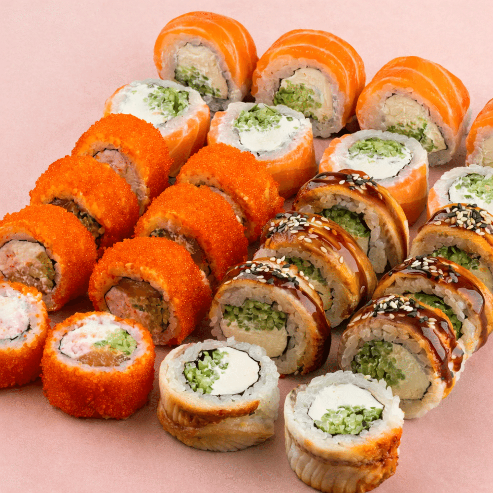 Изысканное трио для настоящих гурманов. Насладитесь безупречным сочетанием угря, лосося и сливочного сыра в каждом кусочке. В составе: Филадельфия с огурцом, Дракон, Калифорния с лососем 24 шт.