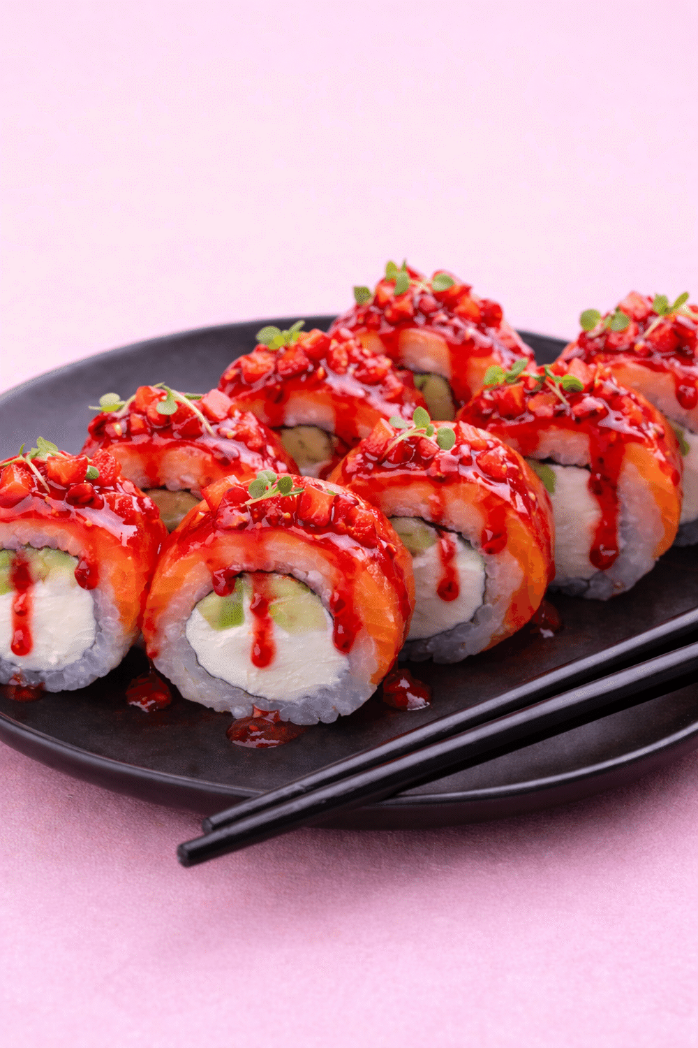 Состав: Лосось, творожный сыр, авокадо, нори, клюквенный соус, клубника
